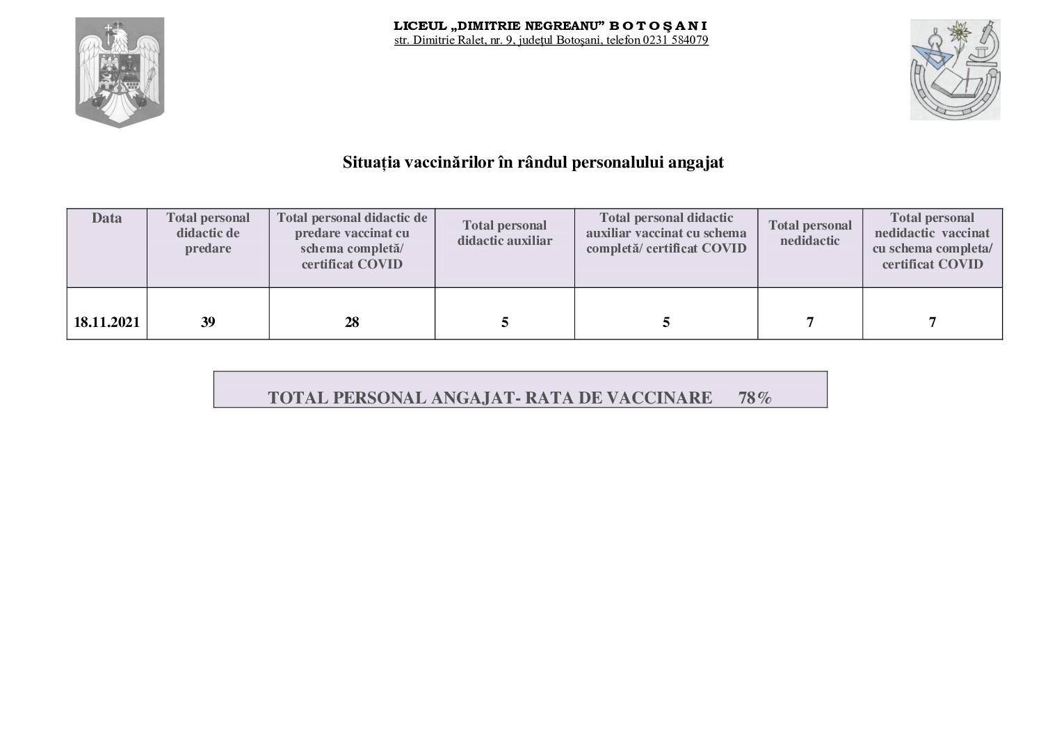 Situația vaccinărilor în rândul personalului angajat 18.11.2021